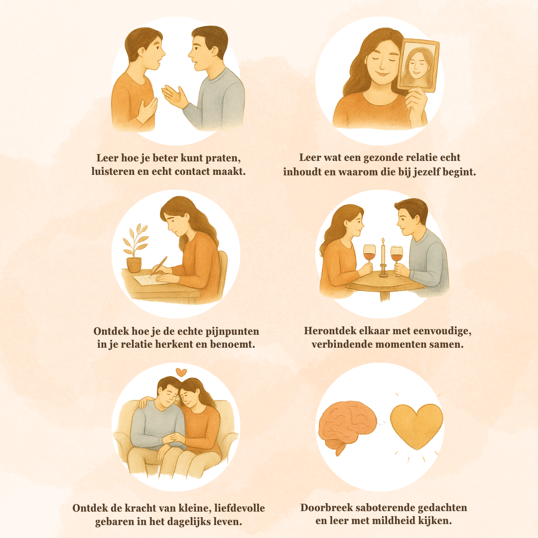Het is geen theorie voor in de kast, maar praktische begeleiding die je thuis, in je eigen tempo, kunt volgen. Zonder oordeel, maar met de duidelijkheid die nodig is om weer dichter bij elkaar te komen.